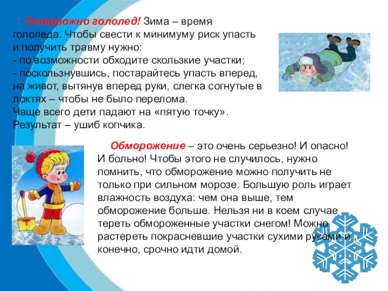 Обморожение – это очень серьезно! И опасно! И больно! Чтобы этого не случилось, нужно помнить, что обморожение можно получить не только при сильном морозе. Большую роль играет влажность воздуха: чем она выше, тем обморожение больше. Нельзя ни в коем случае тереть обмороженные участки снегом! Можно растереть покрасневшие участки сухими руками и ,конечно, срочно идти домой.