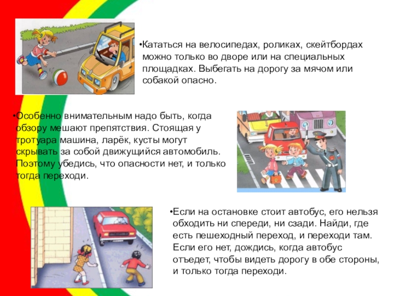 Особенно внимательным надо быть, когда обзору мешают препятствия. Стоящая у тротуара машина, ларёк, кусты могут скрывать за собой движущийся автомобиль. Поэтому убедись, что опасности нет, и только тогда переходи.