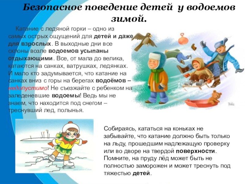 Собираясь, кататься на коньках не забывайте, что катание должно быть только на льду, прошедшим надлежащую проверку или во дворе на твердой поверхности. Помните, на пруду лёд может быть не полностью заморожен и может треснуть под тяжестью детей.