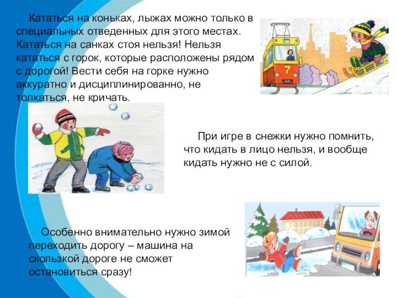При игре в снежки нужно помнить, что кидать в лицо нельзя, и вообще кидать нужно не с силой.