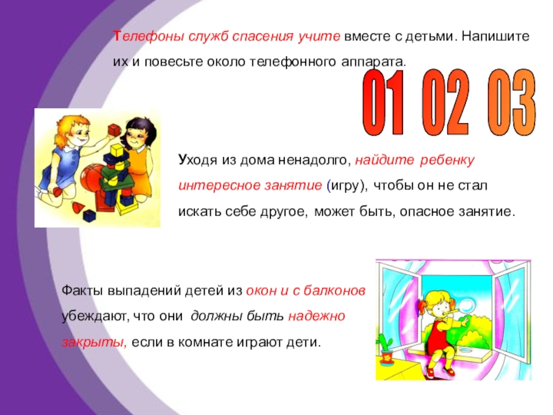 Уходя из дома ненадолго, найдите ребенку интересное занятие (игру), чтобы он не стал искать себе другое, может быть, опасное занятие.