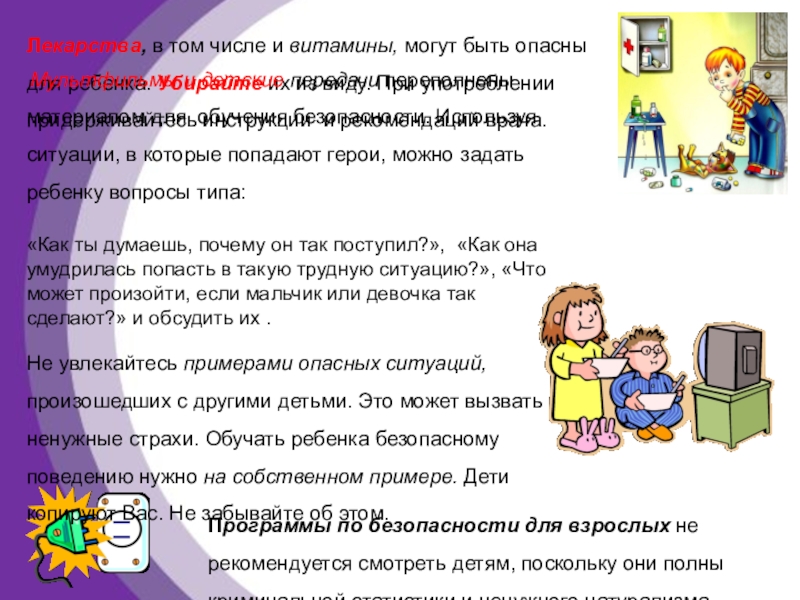 Мультфильмы и детские передачи переполнены материалом для обучения безопасности. Используя ситуации, в которые попадают герои, можно задать