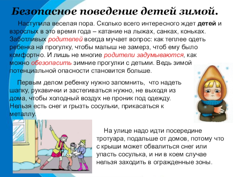 На улице надо идти посередине тротуара, подальше от домов, потому что с крыши может обвалиться снег или упасть сосулька, и ни в коем случае нельзя заходить в огражденные зоны.