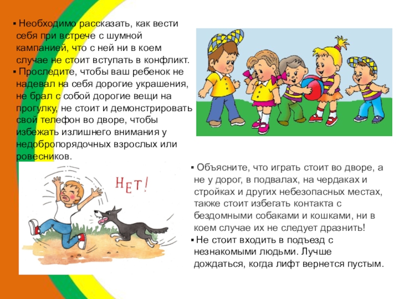 Объясните, что играть стоит во дворе, а не у дорог, в подвалах, на чердаках и стройках и других небезопасных местах, также стоит избегать контакта с бездомными собаками и кошками, ни в коем случае их не следует дразнить!