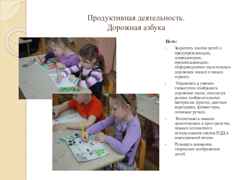 Упражнять в умении схематично изображать дорожные знаки, используя разные изобразительные материалы (краски, цветные карандаши, фломастеры, гелиевые ручки).
