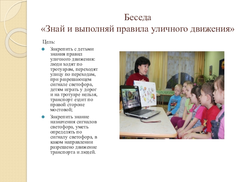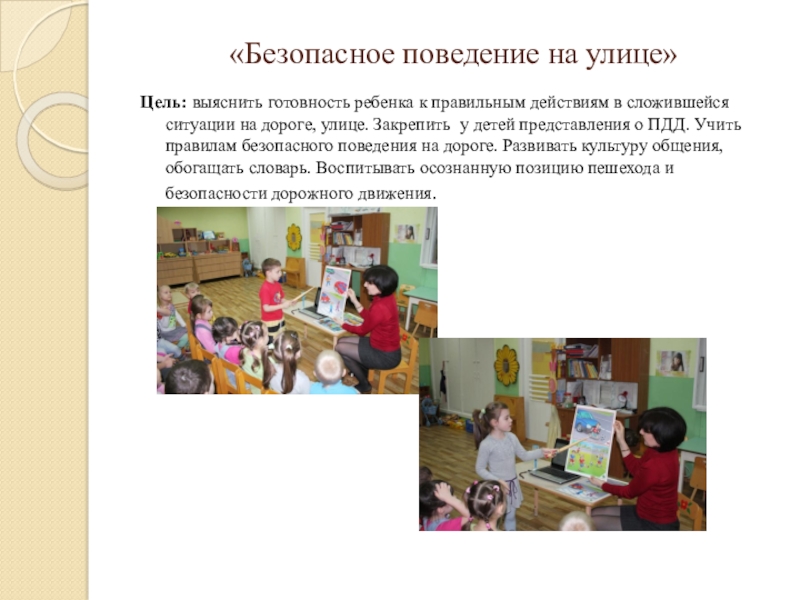 сложившейся ситуации на дороге, улице. Закрепить у детей представления о ПДД. Учить правилам безопасного поведения на дороге. Развивать культуру общения, обогащать словарь. Воспитывать осознанную позицию пешехода и безопасности дорожного движения.