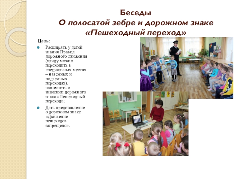 детей знания Правил дорожного движения (улицу можно переходить в специальных местах – наземных и подземных переходах), напомнить о значении дорожного знака «Пешеходный переход»;