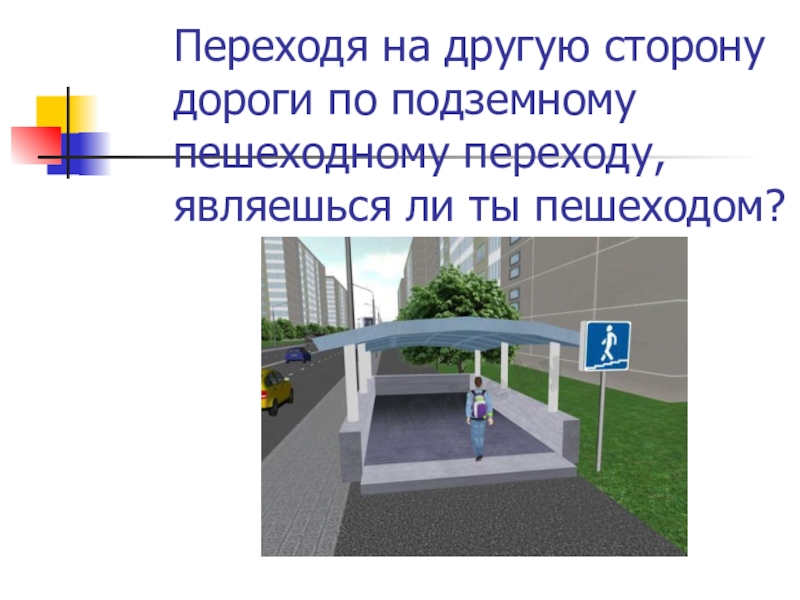 Слайд 37Переходя на другую сторону дороги по подземному пешеходному переходу, являешься ли