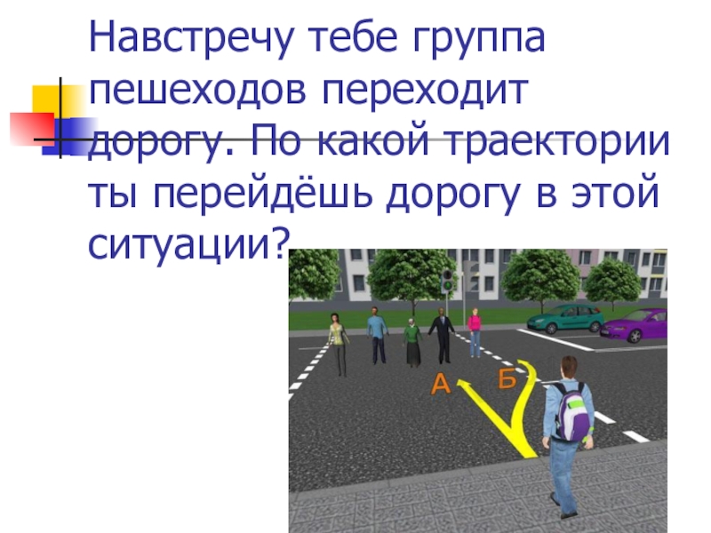 Слайд 36Навстречу тебе группа пешеходов переходит дорогу. По какой траектории ты перейдёшь