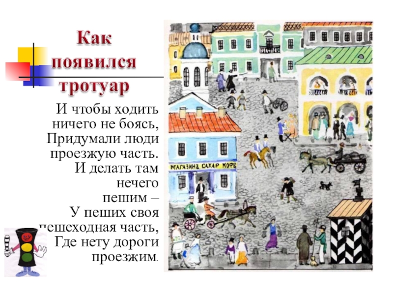 И чтобы ходить ничего не боясь,Придумали люди проезжую часть.И делать там нечего пешим – У пеших своя