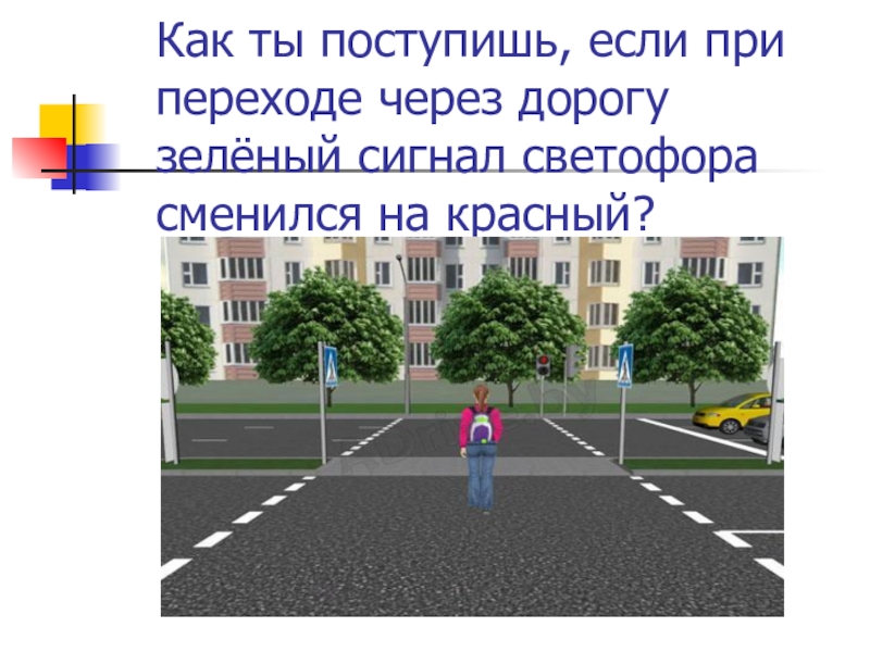 Как ты поступишь, если при переходе через дорогу зелёный сигнал светофора сменился на красный?