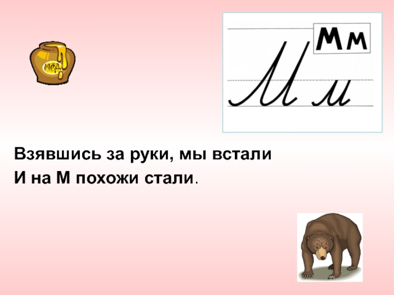 Взявшись за руки, мы всталиИ на М похожи стали.