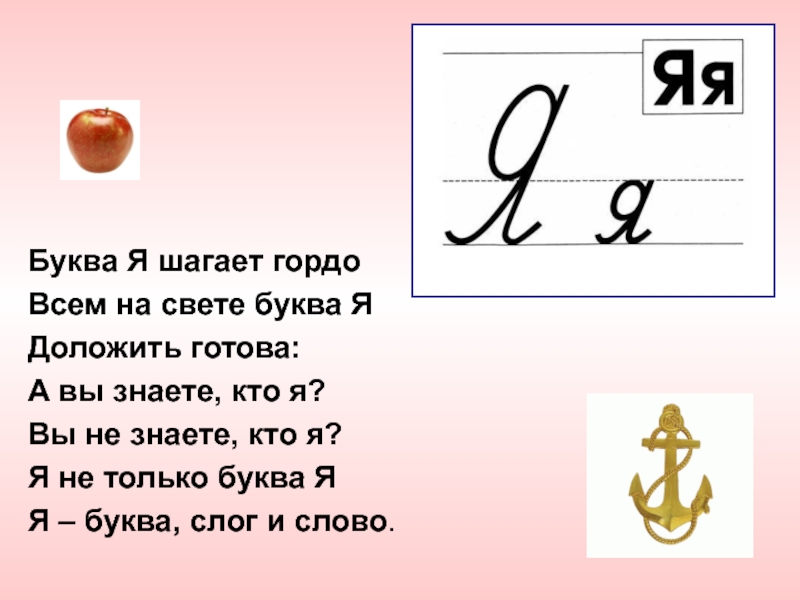 Буква Я шагает гордоВсем на свете буква ЯДоложить готова:А вы знаете, кто я?Вы не знаете, кто я?Я