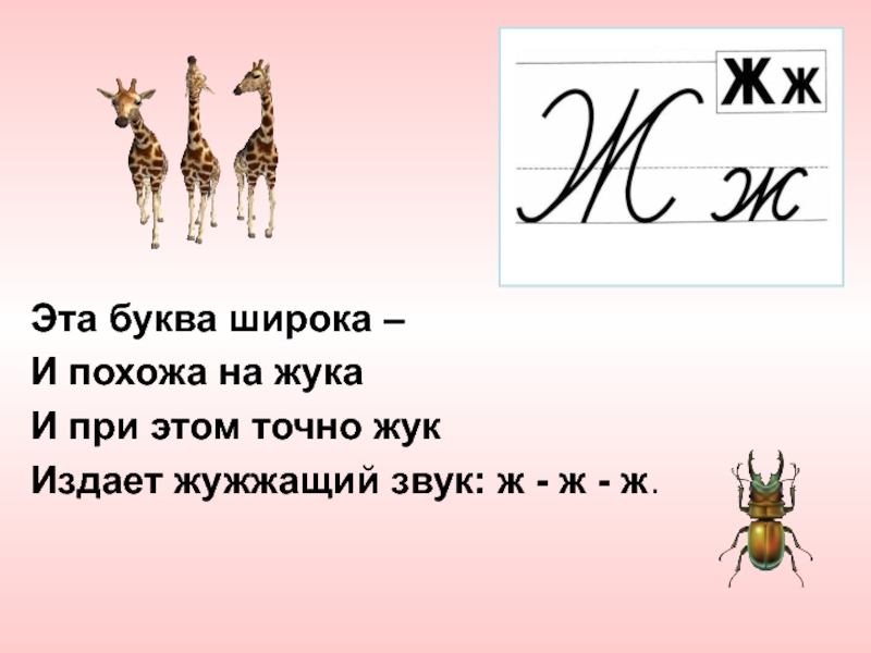 Эта буква широка –И похожа на жука И при этом точно жукИздает жужжащий звук: ж - ж