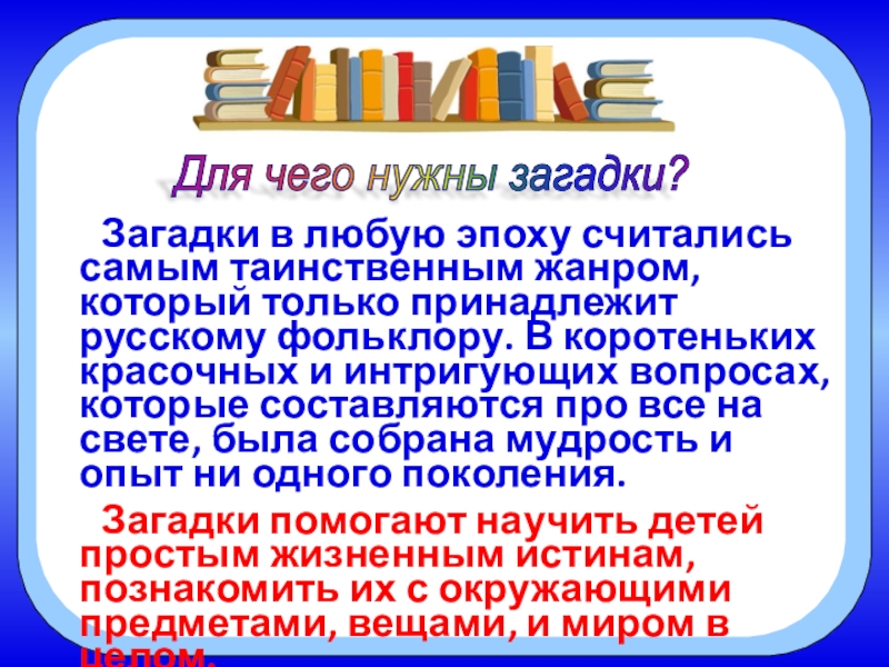 жанром, который только принадлежит русскому фольклору. В коротеньких красочных и интригующих вопросах, которые составляются про все на свете, была собрана мудрость и опыт ни одного поколения.