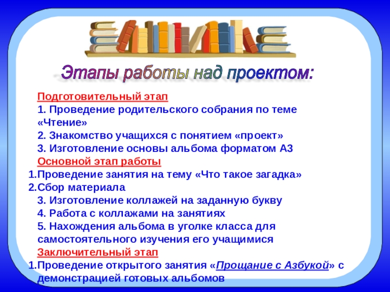 Проведение открытого занятия «Прощание с Азбукой» с демонстрацией готовых альбомов
