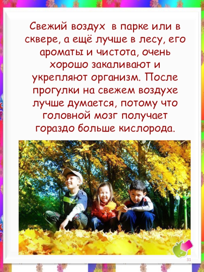 Слайд 31Свежий воздух в парке или в сквере, а ещё лучше в