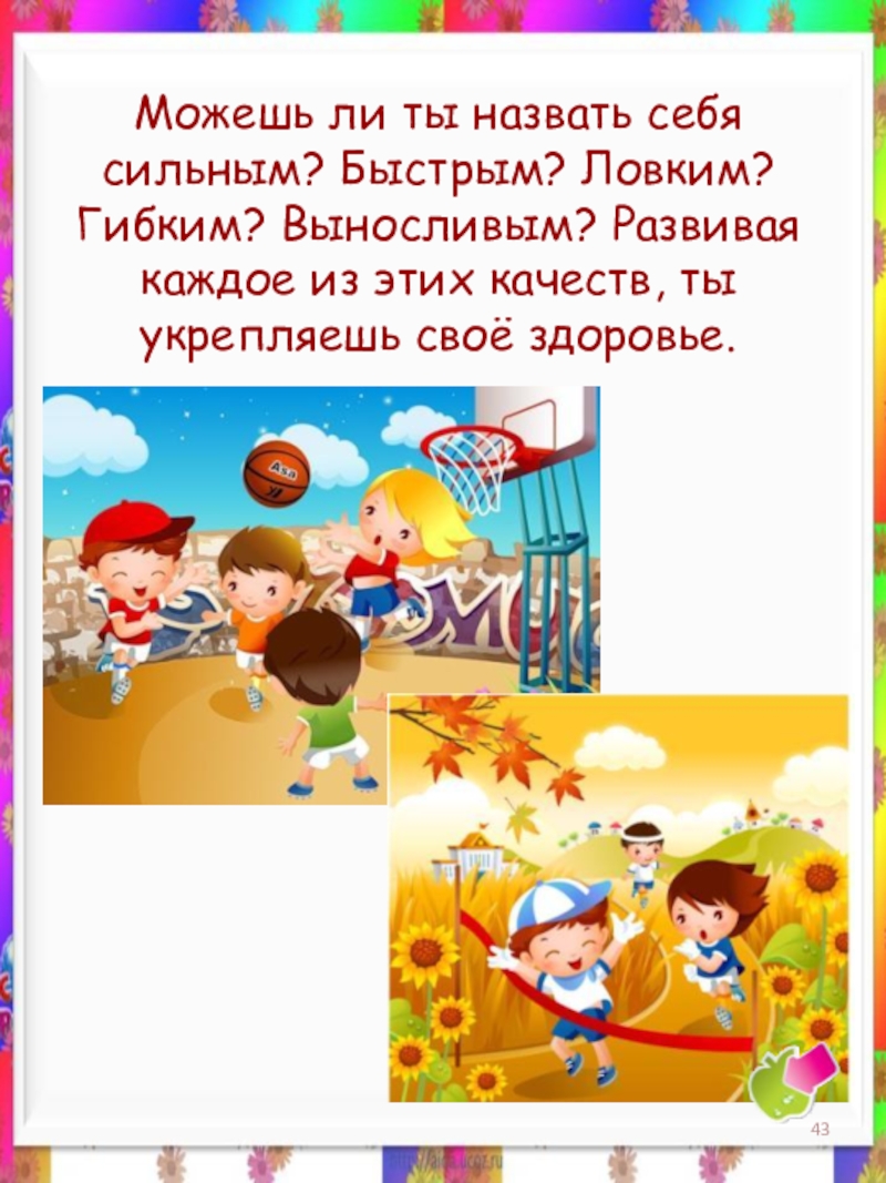 Слайд 43Можешь ли ты назвать себя сильным? Быстрым? Ловким? Гибким? Выносливым? Развивая