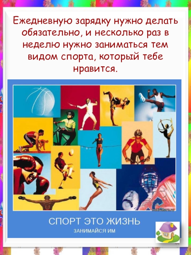 Слайд 44Ежедневную зарядку нужно делать обязательно, и несколько раз в неделю нужно