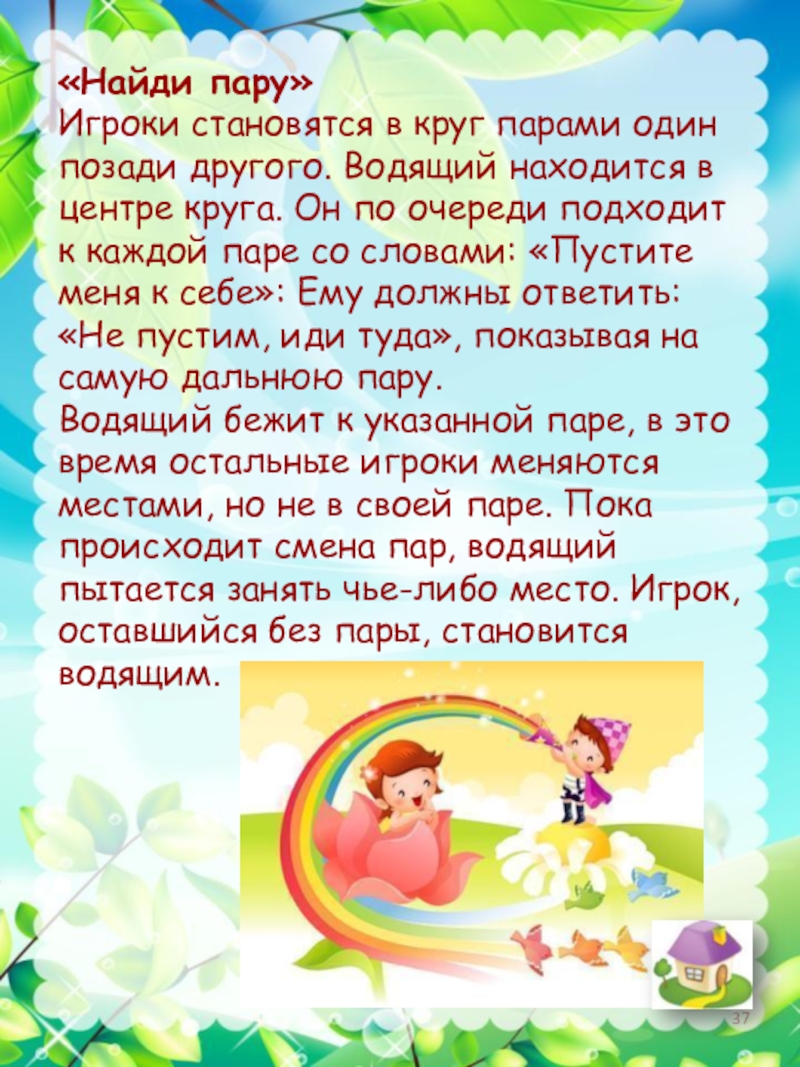 в центре круга. Он по очереди подходит к каждой паре со словами: «Пустите меня к себе»: Ему должны ответить: «Не пустим, иди туда», показывая на самую дальнюю пару.