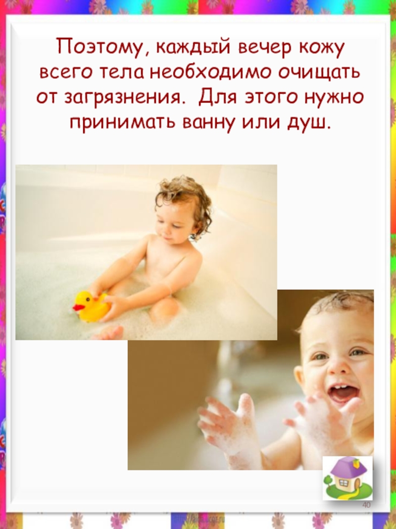 Слайд 40Поэтому, каждый вечер кожу всего тела необходимо очищать от загрязнения. Для