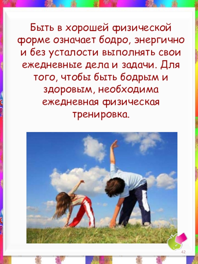Слайд 42Быть в хорошей физической форме означает бодро, энергично и без усталости