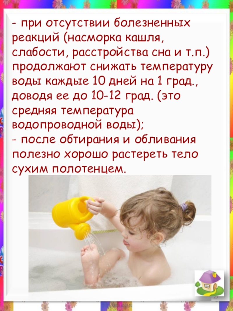 - продолжают делать обтирания и обливания в течение 2-3 месяцев;
