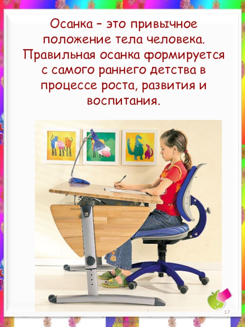 Слайд 17Осанка – это привычное положение тела человека. Правильная осанка формируется с