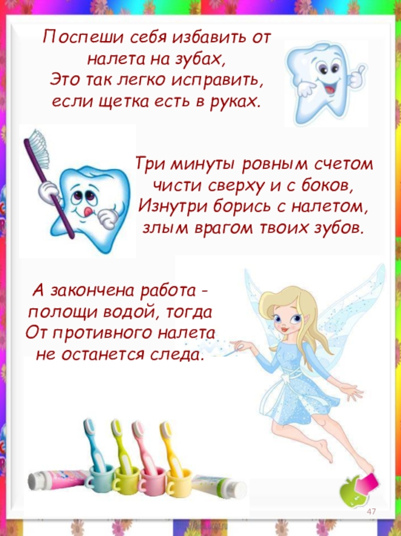 Слайд 47Поспеши себя избавить от налета на зубах,