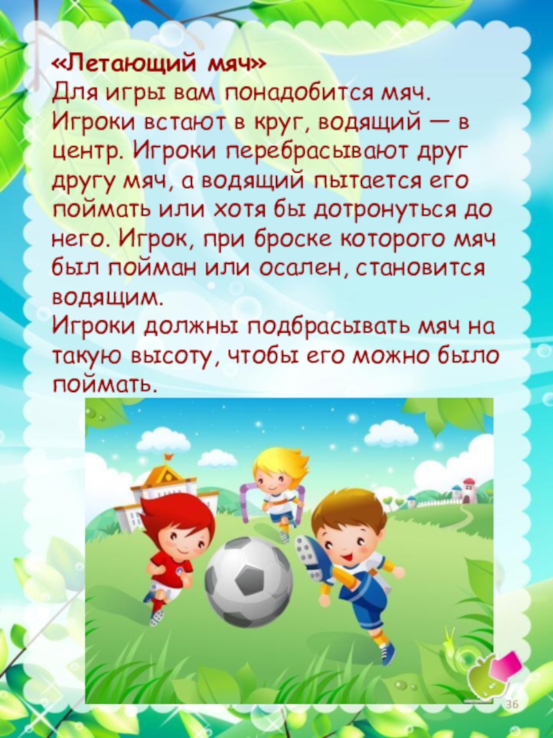 в центр. Игроки перебрасывают друг другу мяч, а водящий пытается его поймать или хотя бы дотронуться до него. Игрок, при броске которого мяч был пойман или осален, становится водящим.