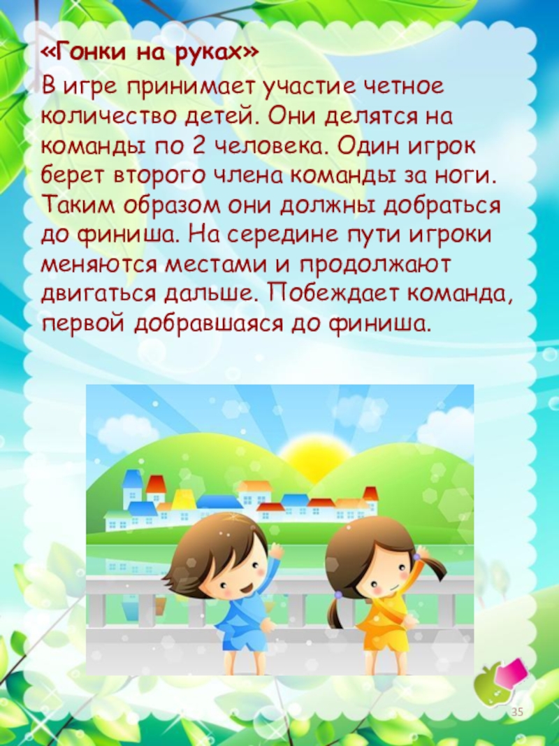 на команды по 2 человека. Один игрок берет второго члена команды за ноги. Таким образом они должны добраться до финиша. На середине пути игроки меняются местами и продолжают двигаться дальше. Побеждает команда, первой добравшаяся до финиша.