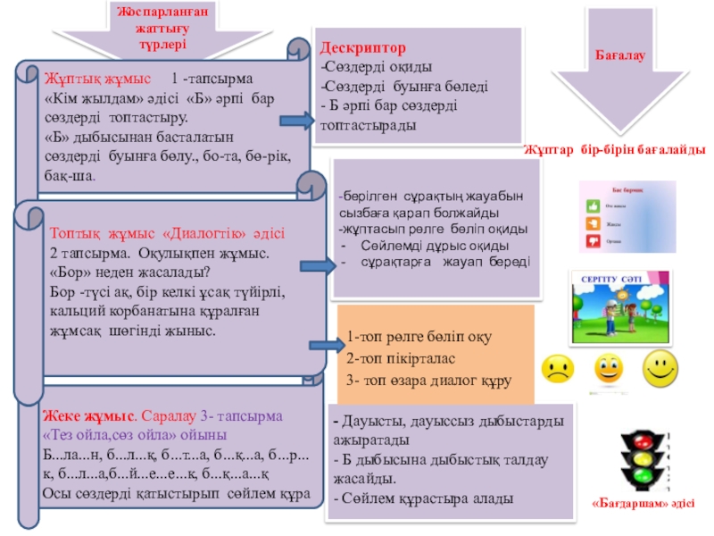 Кейбір оқушылар орындай алады: Сөздегі дыбыс түрлерін ажыратады және жиі кездесетін сөздерді түсініп оқиды және жай сөйлем құрайды
