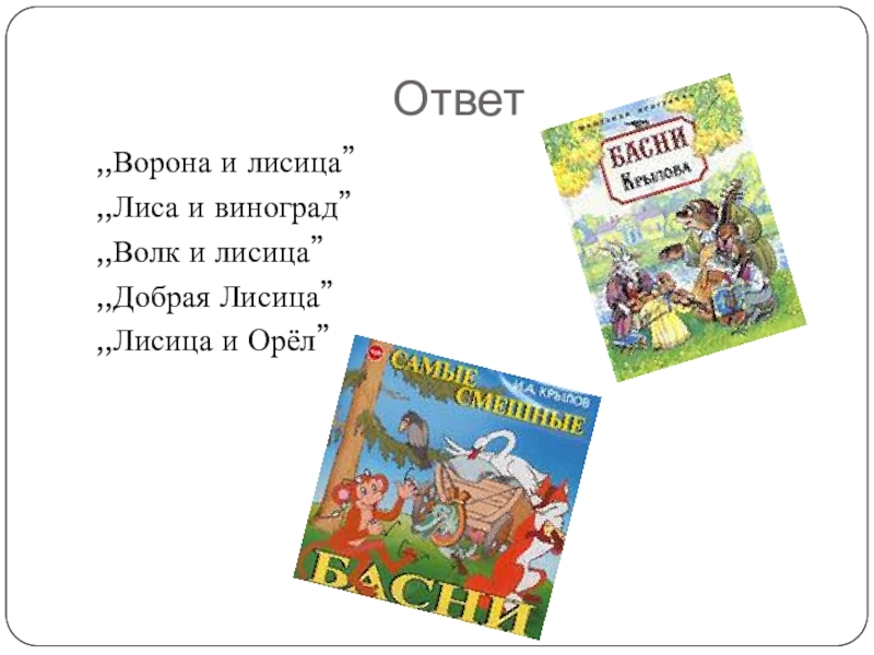 Ответ,,Ворона и лисица”,,Лиса и виноград”,,Волк и лисица”,,Добрая Лисица”,,Лисица и Орёл”