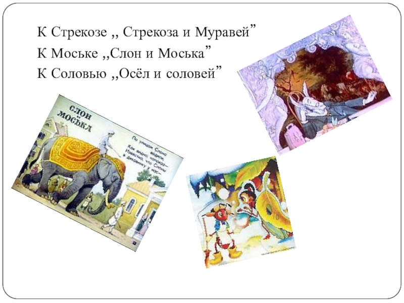 К Стрекозе ,, Стрекоза и Муравей”К Моське ,,Слон и Моська”К Соловью ,,Осёл и соловей”