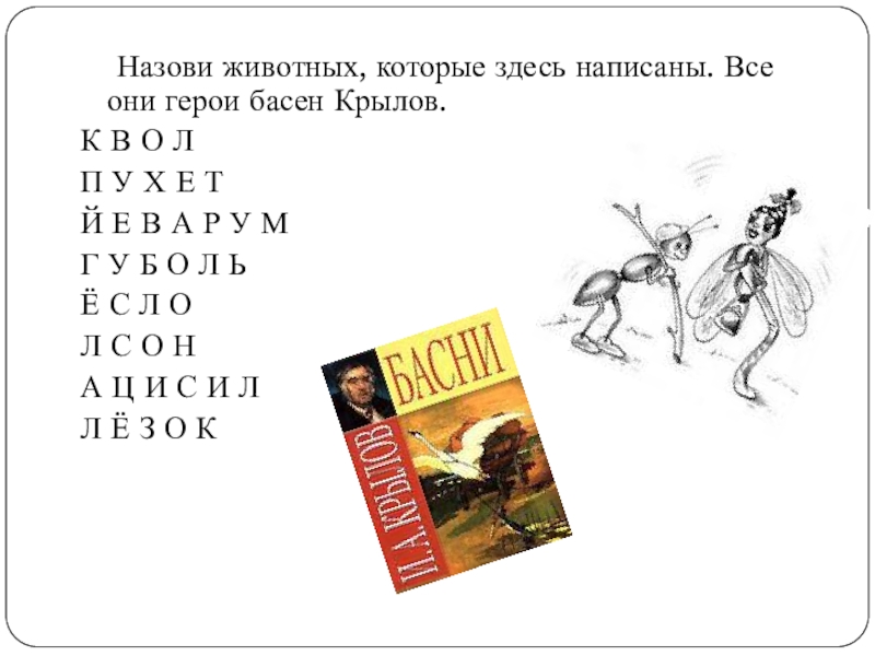 Назови животных, которые здесь написаны. Все они герои басен Крылов.К В О ЛП У Х