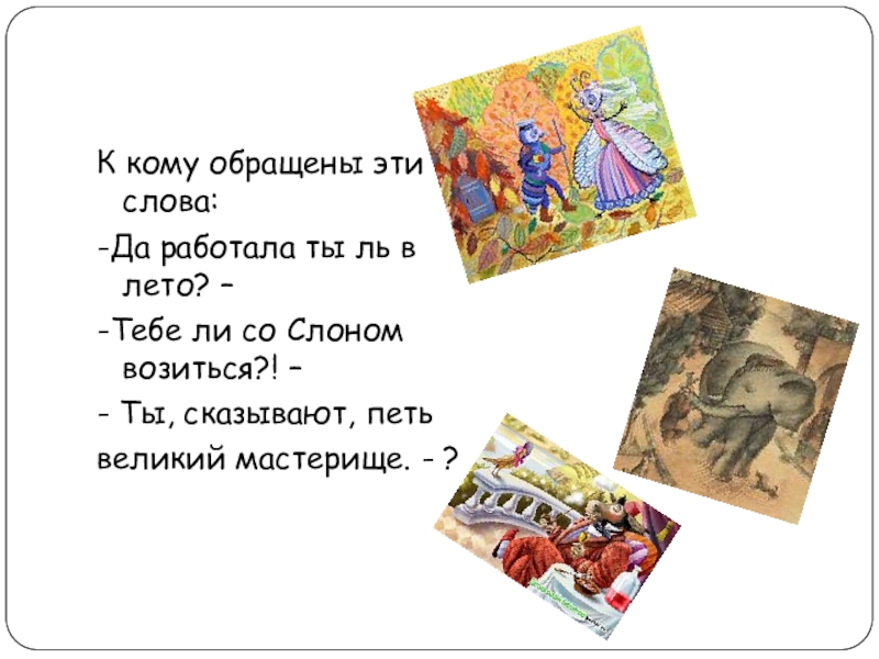 К кому обращены эти слова:-Да работала ты ль в лето? – -Тебе ли со Слоном возиться?! –-