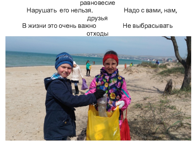 бы было равновесие Нарушать его нельзя. Надо с вами, нам, друзья В жизни это очень важно Не выбрасывать отходы Для тебя и для меня. И не загрязнять моря!