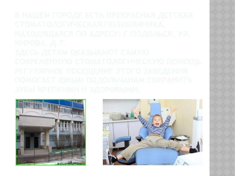 Слайд 24В нашем городе есть прекрасная детская стоматологическая поликлиника, находящаяся по адресу: