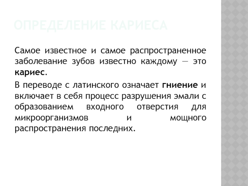 В переводе с латинского означает гниение и включает в себя процесс разрушения эмали с образованием входного отверстия для микроорганизмов и мощного распространения последних.