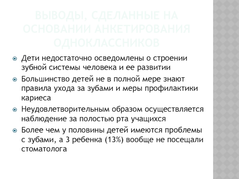 Слайд 22Выводы, сделанные на основании анкетирования одноклассников