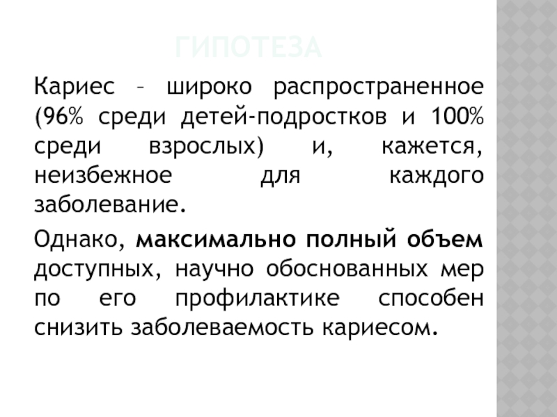 Однако, максимально полный объем доступных, научно обоснованных мер по его профилактике способен снизить заболеваемость кариесом.
