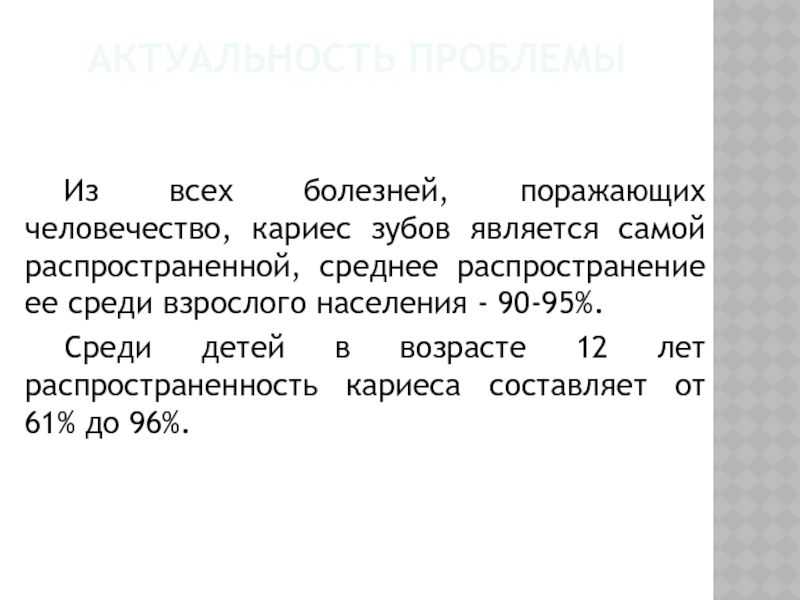 Среди детей в возрасте 12 лет распространенность кариеса составляет от 61% до 96%.