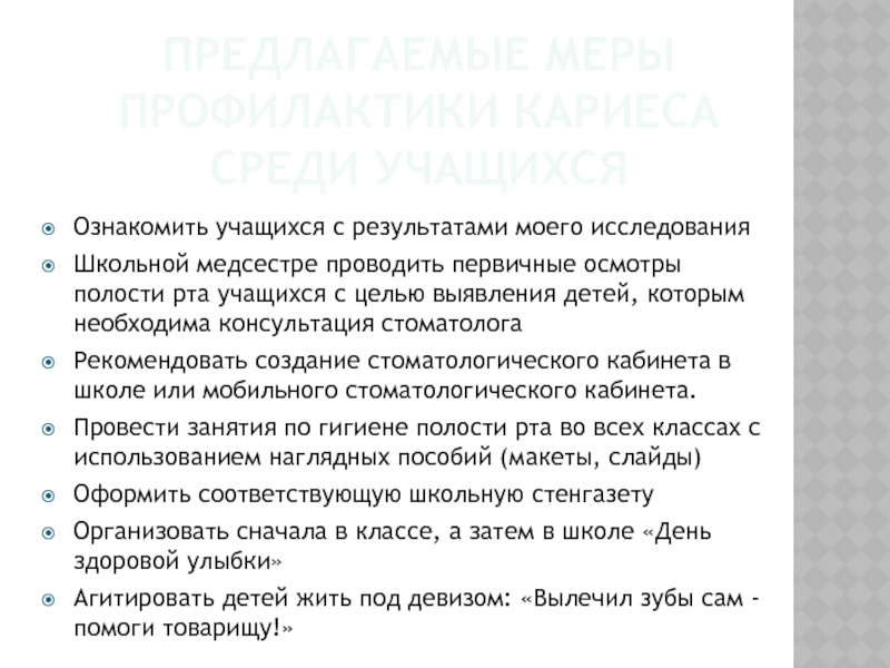Слайд 23Предлагаемые меры профилактики кариеса среди учащихся