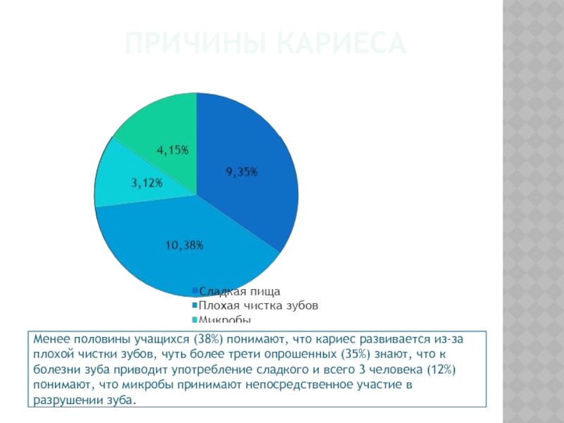 Слайд 20Менее половины учащихся (38%) понимают, что кариес развивается из-за плохой чистки