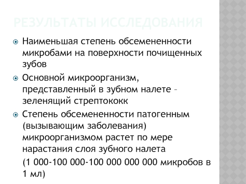 Наименьшая степень обсемененности микробами на поверхности почищенных зубов