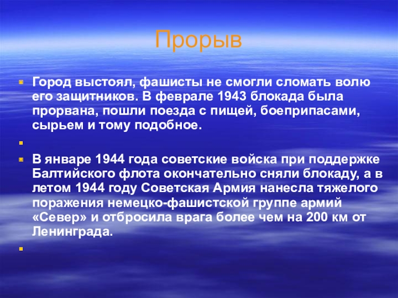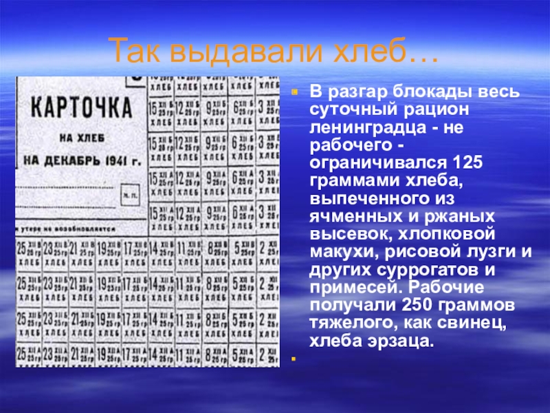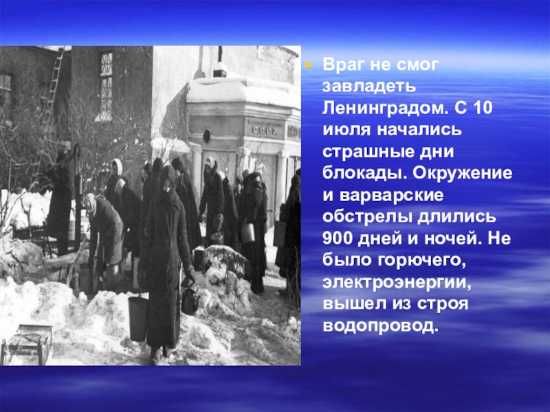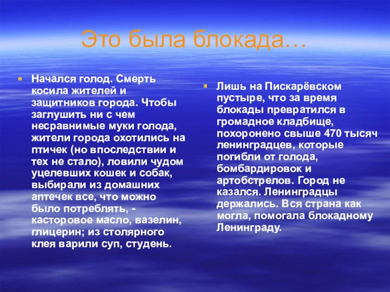 Лишь на Пискарёвском пустыре, что за время блокады превратился в громадное кладбище, похоронено свыше 470 тысяч ленинградцев, которые погибли от голода, бомбардировок и артобстрелов. Город не казался. Ленинградцы держались. Вся страна как могла, помогала блокадному Ленинграду.