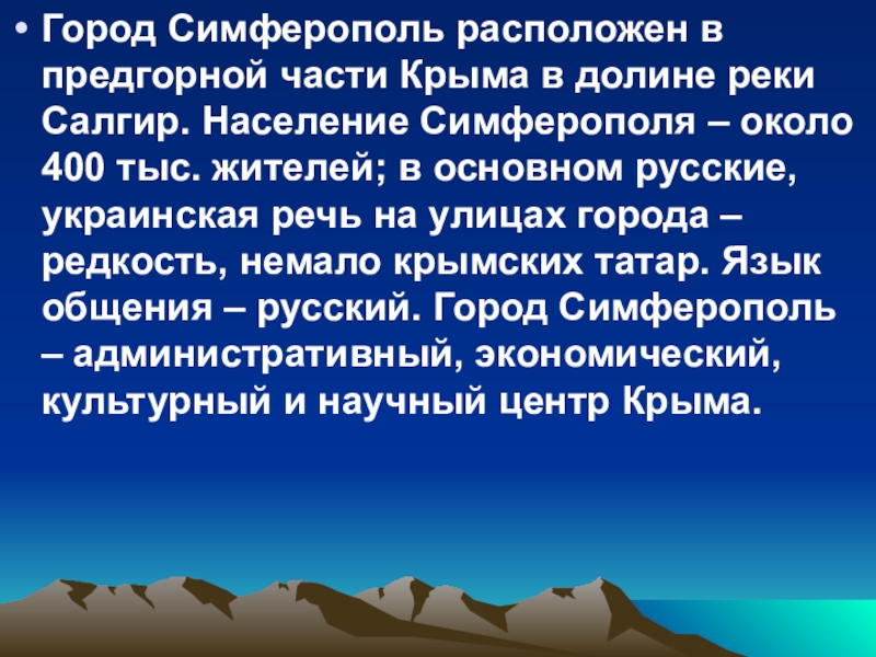 Город Симферополь расположен в предгорной части Крыма в долине реки Салгир. Население Симферополя – около 400 тыс.
