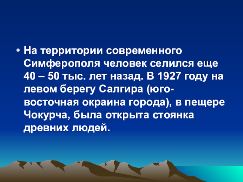 лет назад. В 1927 году на левом берегу Салгира (юго-восточная окраина города), в пещере Чокурча, была открыта стоянка древних людей.