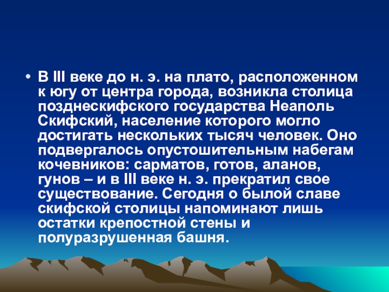 от центра города, возникла столица позднескифского государства Неаполь Скифский, население которого могло достигать нескольких тысяч человек. Оно подвергалось опустошительным набегам кочевников: сарматов, готов, аланов, гунов – и в III веке н. э. прекратил свое существование. Сегодня о былой славе скифской столицы напоминают лишь остатки крепостной стены и полуразрушенная башня.