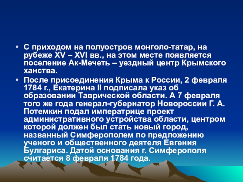 После присоединения Крыма к России, 2 февраля 1784 г., Екатерина II подписала указ об образовании Таврической области. А 7 февраля того же года генерал-губернатор Новороссии Г. А. Потемкин подал императрице проект административного устройства области, центром которой должен был стать новый город, названный Симферополем по предложению ученого и общественного деятеля Евгения Булгариса. Датой основания г. Симферополя считается 8 февраля 1784 года.